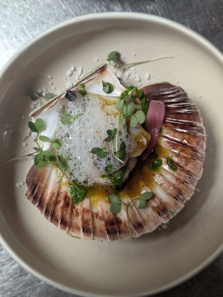 La première entrée était une Saint-Jacques rôtie dans sa coquille, jus de volaille à l’échalote, persillade écume de barbe. C’était tout simplement délicieux : la Saint-Jacques, dans sa coquille, était cuite comme il faut, à la fois rôtie et fondante, se mariant parfaitement avec le jus de volaille à l’échalote. L’accompagnement d’une persillade écume de barbe ajoutait une touche visuelle et gustative surprenante, donnant presque l’impression que la Saint-Jacques manifestait son mécontentement d’être dans mon assiette en produisant de petites bulles, simulant un phénomène naturel. (Bien que les Saint-Jacques ne produisent pas naturellement d’écume, leurs composants peuvent être utilisés pour créer des préparations culinaires surprenantes).