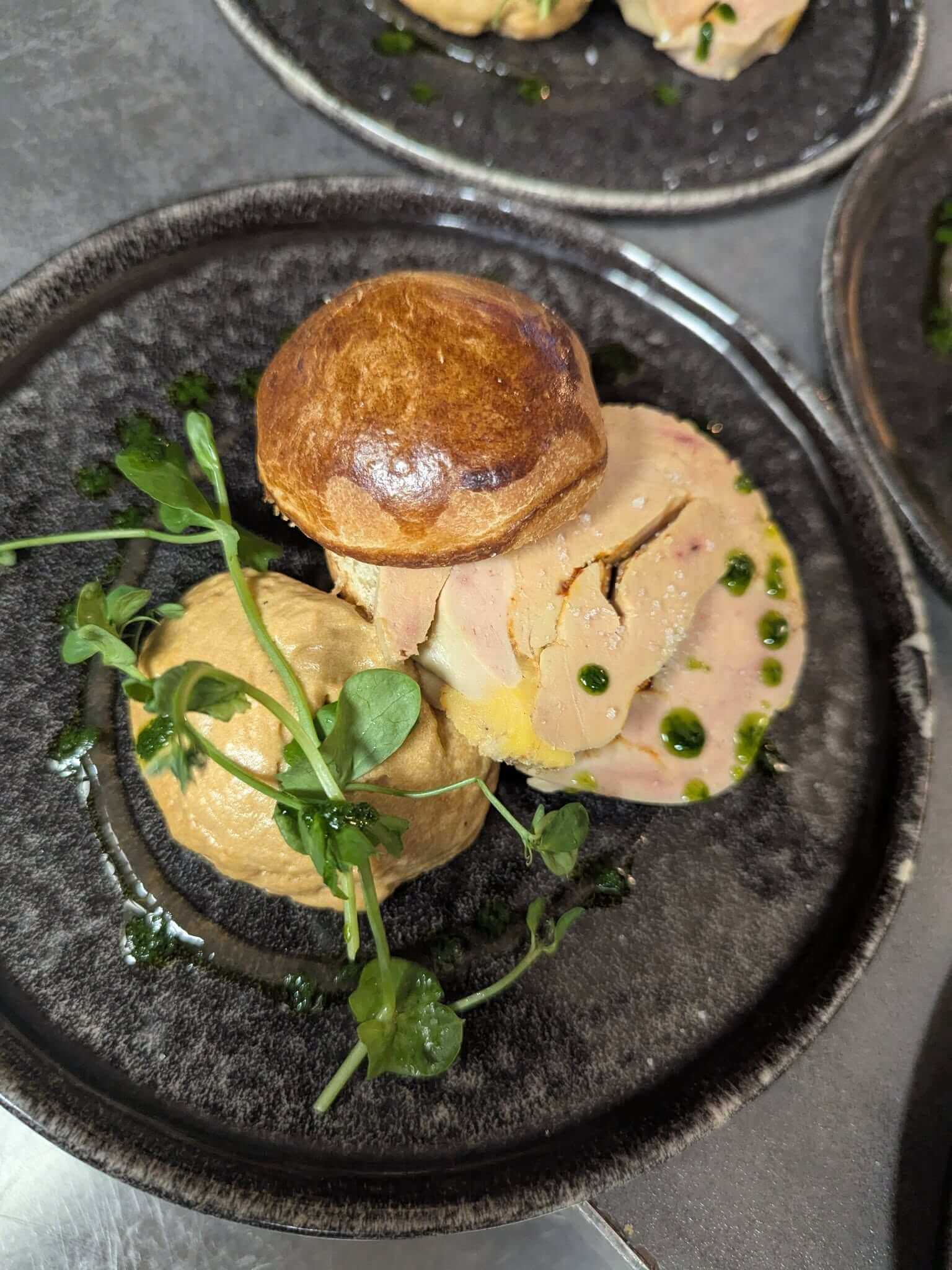 Ensuite, nous enchaînons avec la deuxième entrée, qui semblait classique à première vue, mais qui s’est révélée être, pour moi, l’une des meilleures entrées que j’ai mangées jusqu’à présent 😋. Ce foie gras cuit au torchon, fève de tonka, amaretto et sa brioche m’a littéralement transporté dans une autre dimension. J’étais ébloui par ce mélange de saveurs d’une perfection incroyable. Un mariage harmonieux de parfums et de goûts, qui doit durer toute une vie (bien plus solide que les noces de granit, qui n’ont qu’à bien se tenir !). Le choix d’associer la fève de tonka, dont le goût complexe rappelle la vanille, le caramel et l’amande amère avec une note musquée, à l’amaretto, une liqueur italienne douce-amère à la saveur d’amande prononcée, était tout simplement judicieux. Bref, pour résumer cette seconde entrée en un seul mot : perfection !